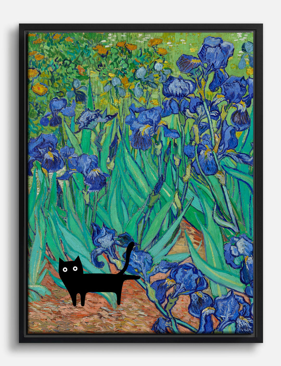 A burst of lush blue irises, inspired by Van Gogh, instantly brings your walls to life—then a playful black cat sneaks in and adds a dash of pure delight. This piece pops with vibrant greens and blues, perfect for making your living room or bedroom feel both classic and quirky. Youll love how its bold palette and cheerful energy turn any space into a conversation starter, making your home feel uniquely yours.