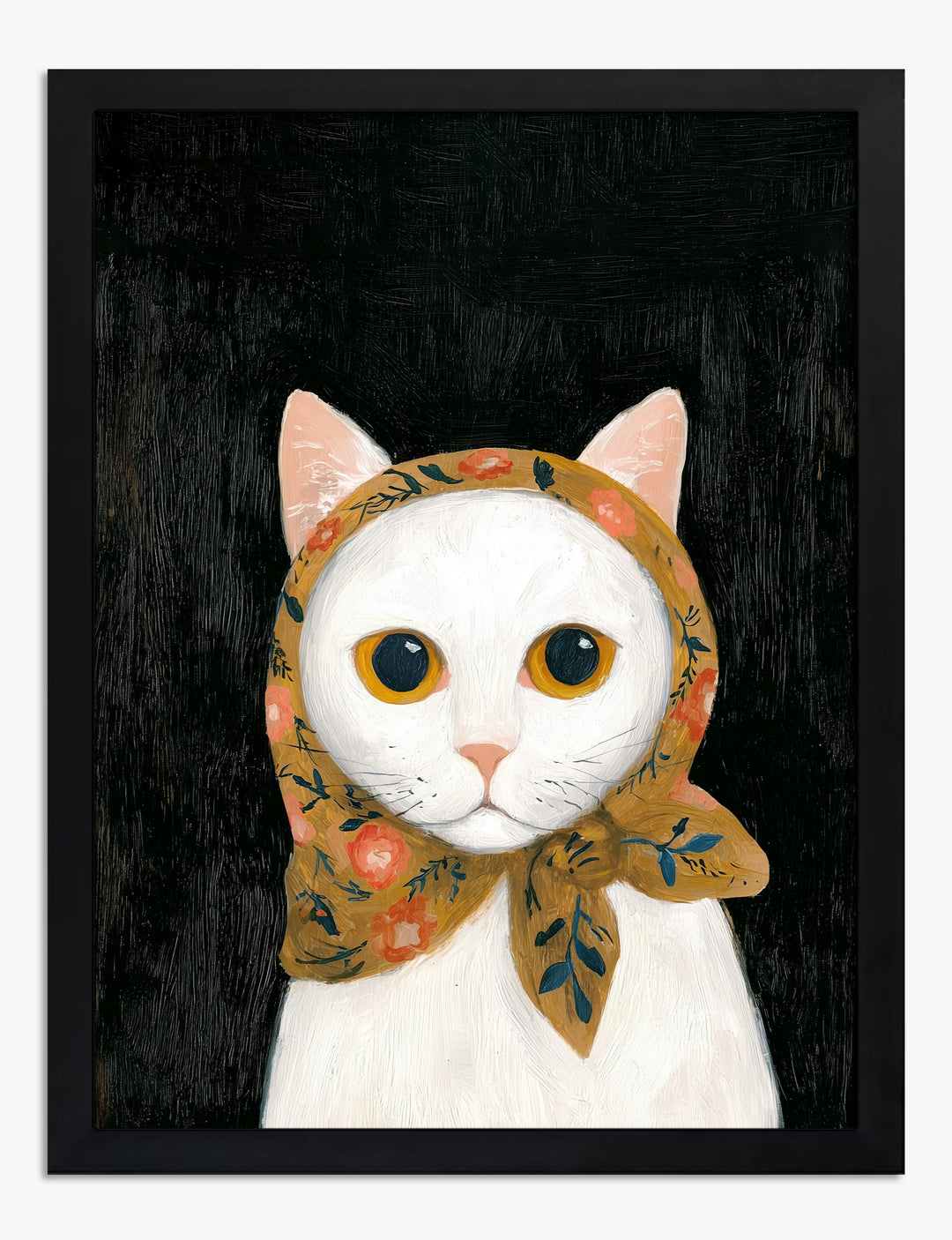 Who says style is just for humans? This playful portrait features a wide-eyed white cat wrapped in a vintage-inspired scarf, instantly adding a dose of personality and charm to your space. The deep black background makes those golden eyes and delicate florals pop, creating a look that’s both bold and irresistibly cute.