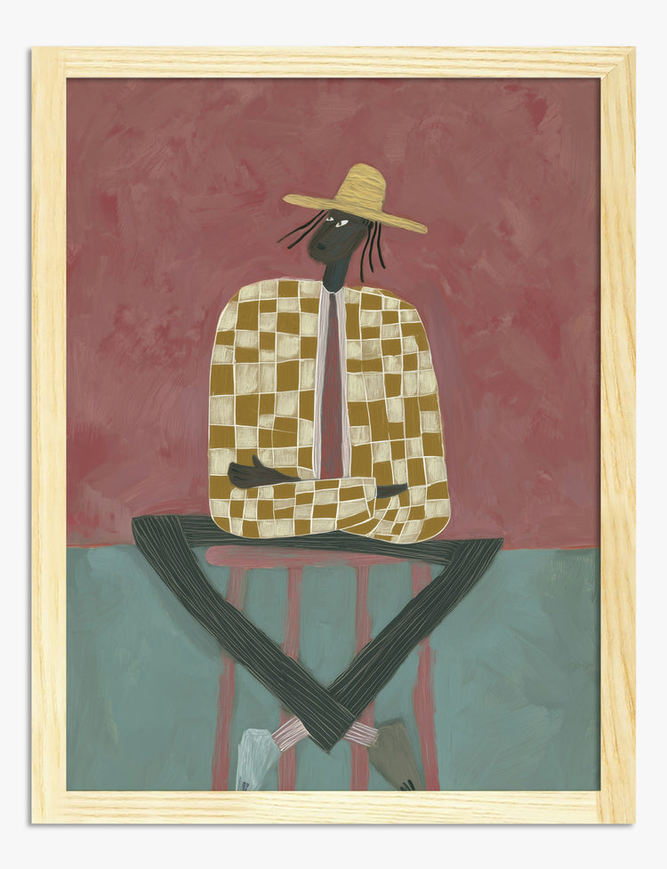 A bold checkered jacket and a wide-brimmed straw hat—this piece is all about effortless cool. The playful, exaggerated proportions and earthy colors draw you in, inviting you to slow down and soak up the vibe. This portrait instantly gives your space a sense of easygoing style, perfect for the living room or a creative nook where you want to feel inspired. The warm golds and muted greens pair beautifully with modern, boho, or eclectic decor, adding a pop of personality without overwhelming the room. Let this striking character become your daily reminder to sit back, cross your legs, and own your unique style. With Fab, transforming your home is as simple as finding art that feels like you.