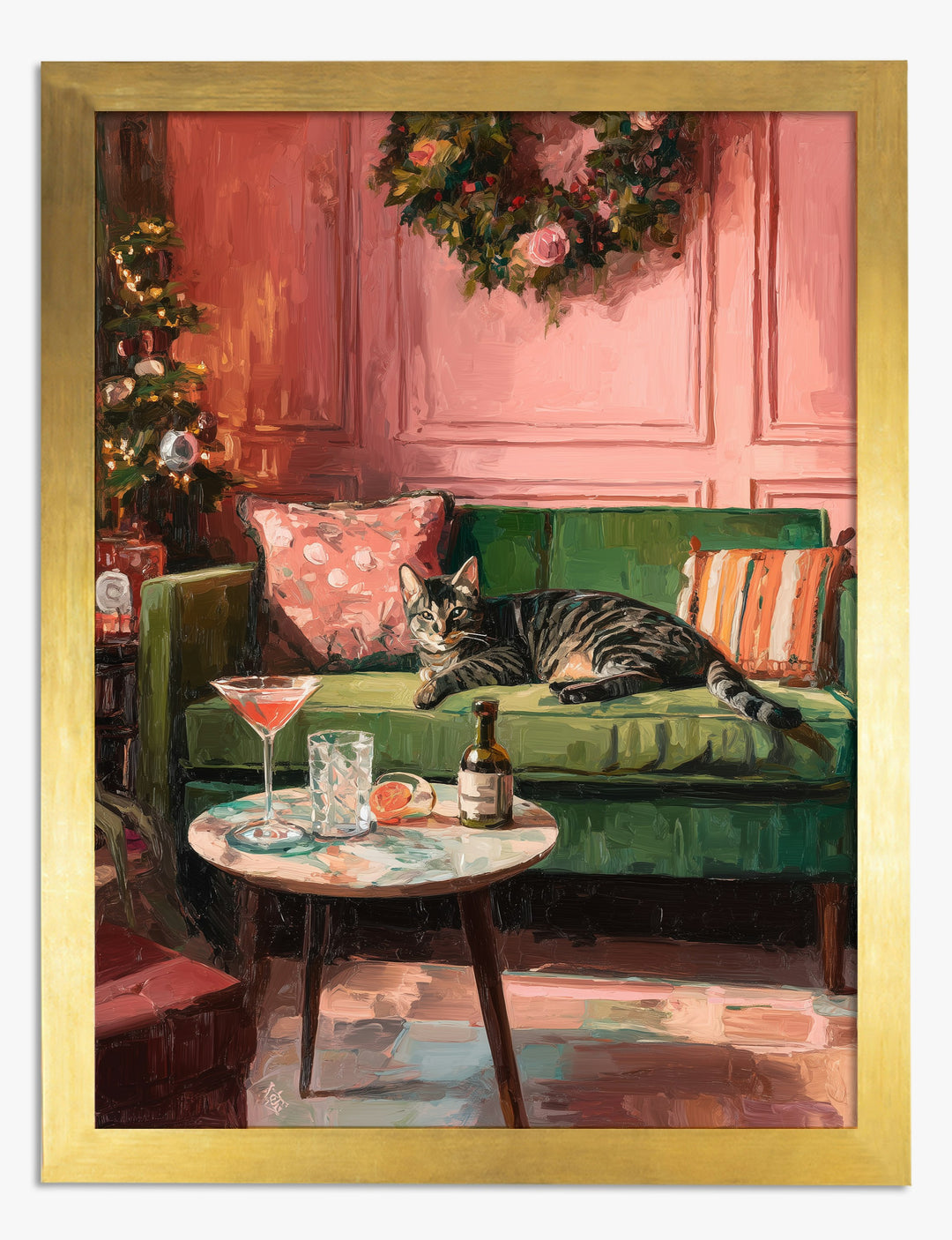 A tabby cat sprawled across a velvet green sofa—this is the heart of holiday comfort. Let this art piece invite a sense of warmth and easygoing style into your space, where every glance feels like a quiet night in with your favorite company. The blush pink walls, festive wreath, and twinkling tree create a welcoming scene that instantly cozies up any room.
