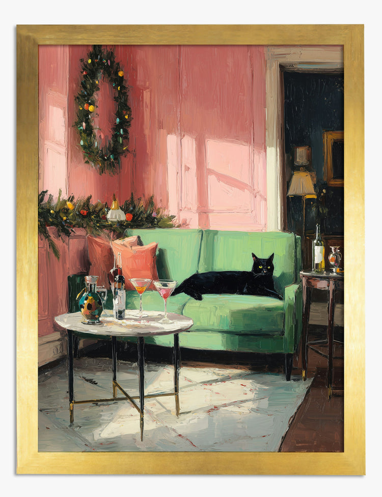 A black cat sprawled on a mint-green sofa sets the tone for cozy, effortless style. With sunlight streaming through rosy pink walls and a touch of holiday greenery, this piece instantly brings warmth and personality to your space.