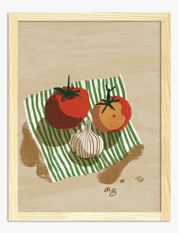 Two ripe tomatoes and a bulb of garlic sit atop a striped cloth, bringing a burst of sunlit color to your space. This playful, painterly piece channels the easy joy of farmer’s market mornings—inviting you to savor simple pleasures every day. Perfect for brightening up your kitchen or dining nook, this print adds a pop of freshness and warmth wherever it goes. The bold reds and soft beige tones work effortlessly with modern or rustic decor, making your style feel curated but never fussy. Let this charming still life remind you: great taste isn’t just for your recipes—it’s for your walls, too. Give your home a dash of personality and let your space feel as inviting as your favorite meal.