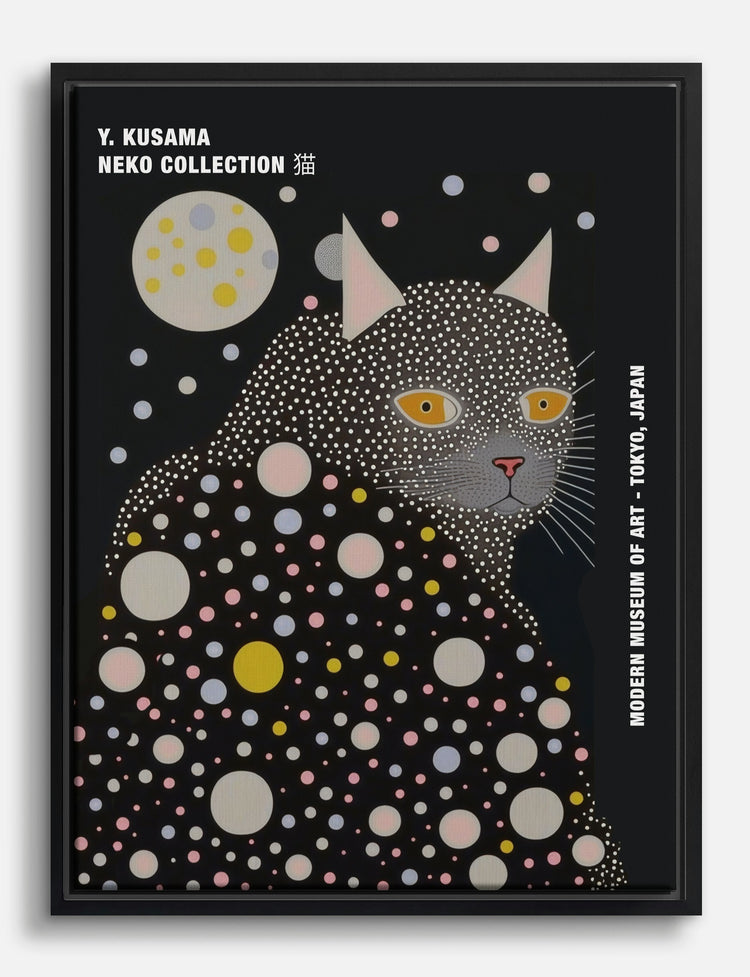 Let your walls purr with personality with this Yayoi Kusama-inspired piece. The whimsical dots and striking gaze of the cat bring a playful yet sophisticated energy to your space. Perfect for adding a touch of modern art to your living room or bedroom, this artwork harmonizes beautifully with both minimalist and eclectic styles. Transform your home into a gallery of joy and creativity without breaking the bank.