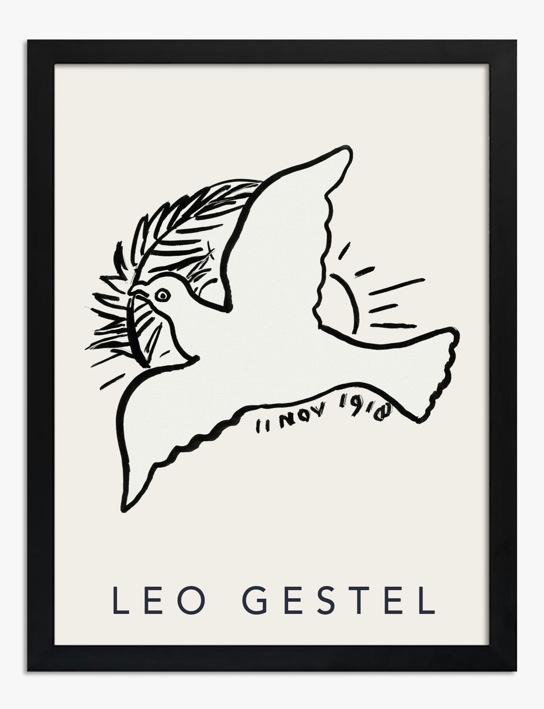 A single, soaring dove brings a gentle sense of hope and possibility to your space. This iconic line drawing by Leo Gestel radiates calm, with its simple black strokes and uplifting energy. The delicate sun and olive branch details hint at new beginnings and endless optimism.