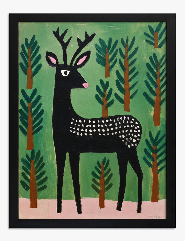 Step into a world where whimsy meets wonder. This bold black deer, dotted with white spots, stands tall and curious in a stylized forest of deep greens and playful pinks. It’s the kind of piece that instantly adds character and a dash of modern charm to your space. Perfect for a living room that needs a pop of personality or a kids’ room that craves a touch of magic. The graphic shapes and fresh palette make it easy to pair with both minimalist and eclectic decor, so you can express your unique style without overthinking it. You’ll love how this print sparks conversation and brings a sense of joyful pride to your home. Affordable, approachable, and uniquely Fab—it’s your turn to transform your walls with confidence.