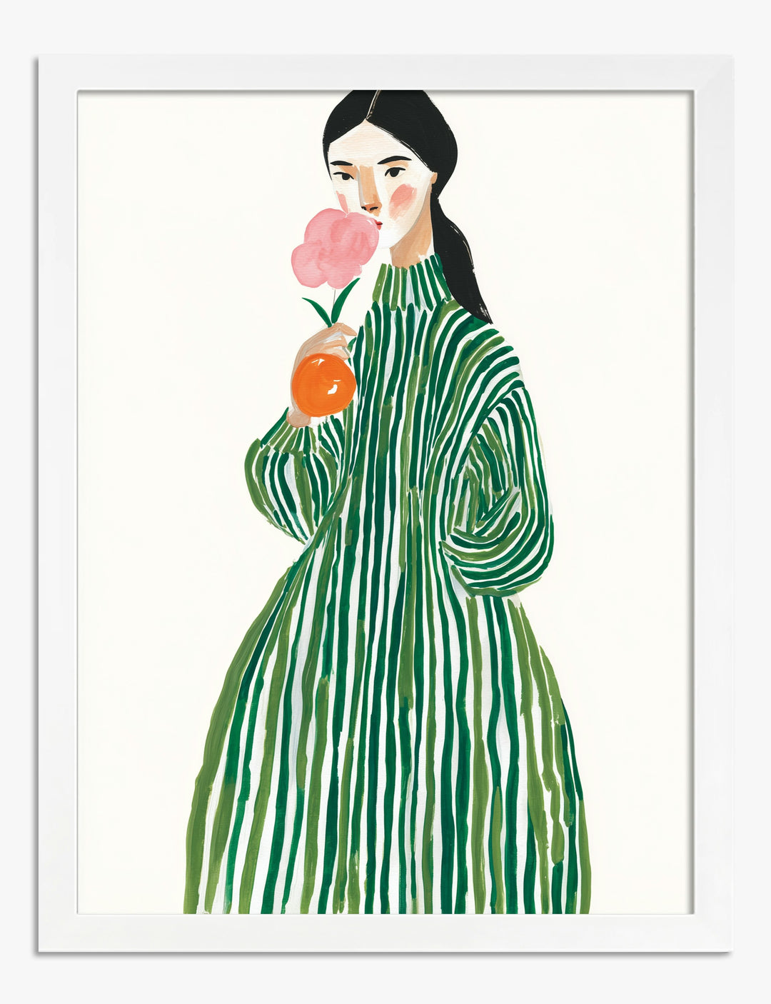 Who says art can’t feel fresh and playful? This whimsical portrait of a woman in a green striped dress, holding a delicate pink flower and a bright orange, instantly invites a sense of effortless style into your space. Let her calm confidence and gentle palette inspire a corner of your living room or bedroom, where you want a touch of personality without overwhelming the vibe. The soft greens and blush tones pop against neutral walls, making it easy to layer with your favorite throws or accent pillows. You don’t need a design degree to make your home feel special—just a piece that feels like you. Every glance is a reminder that style is about expressing what you love, not following rules.