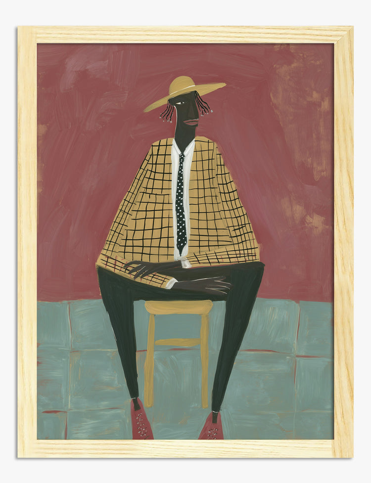 Bold style meets effortless cool in this unforgettable portrait. Striking earthy tones and graphic lines create an instant focal point, wherever you hang it. The relaxed pose and dapper checked jacket radiate easy confidence — youll feel it every time you walk by. This piece brings a fresh, modern vibe to your living room or home office, pairing beautifully with both neutral palettes and playful pops of color. The warm clay backdrop and subtle grid pattern invite you to slow down and savor the moment. Ready to turn your space into a reflection of your unique style? Let this print be your daily reminder: great design is personal, approachable, and always within reach.