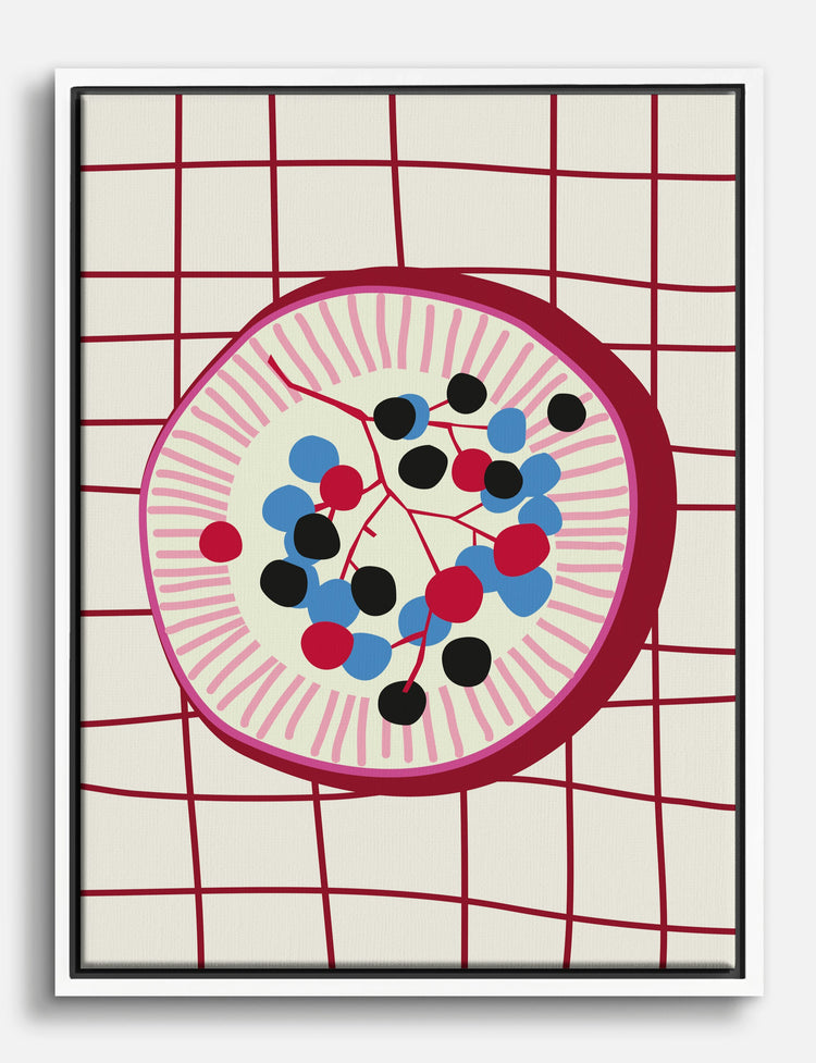 Bold color meets playful energy in this striking berry-inspired piece. Instantly brighten your kitchen or dining space with its lively reds, blues, and blacks—its like a joyful pop of summer on your wall. The geometric grid background gives it a contemporary twist, effortlessly blending with both modern and eclectic décor.