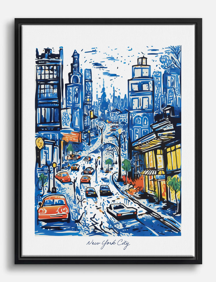 Bold, sweeping lines capture the electric pulse of New York City in this lively cityscape. You’ll feel the energy of bustling streets and glowing windows every time you glance its way—perfect for sparking inspiration in your living room or giving your office a stylish edge. The cool blues and pops of orange and yellow make it easy to pair with both modern and eclectic décor. Add a touch of urban adventure to your space and let your walls tell a story that’s uniquely yours.