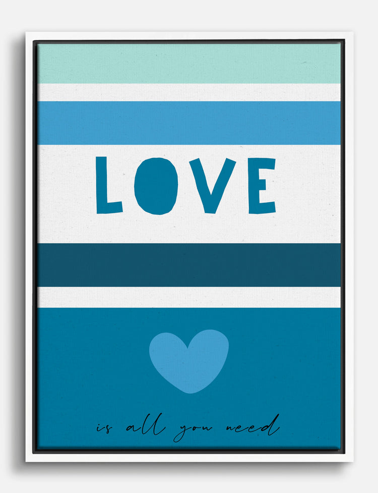 Bold blocks of blue and a playful heart come together in this uplifting piece, radiating warmth and positivity. Let your walls do the talking—this artwork reminds you daily that love is all you need, bringing a sense of calm and comfort to your favorite space.