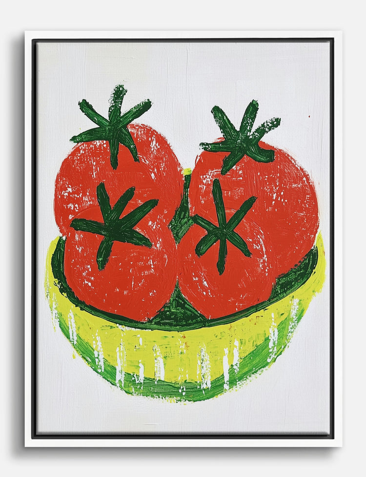 Three ripe tomatoes, bursting with color, instantly energize whatever room you hang them in. This playful, hand-drawn piece feels like a fresh-picked moment, ready to add a pop of joy to your home.