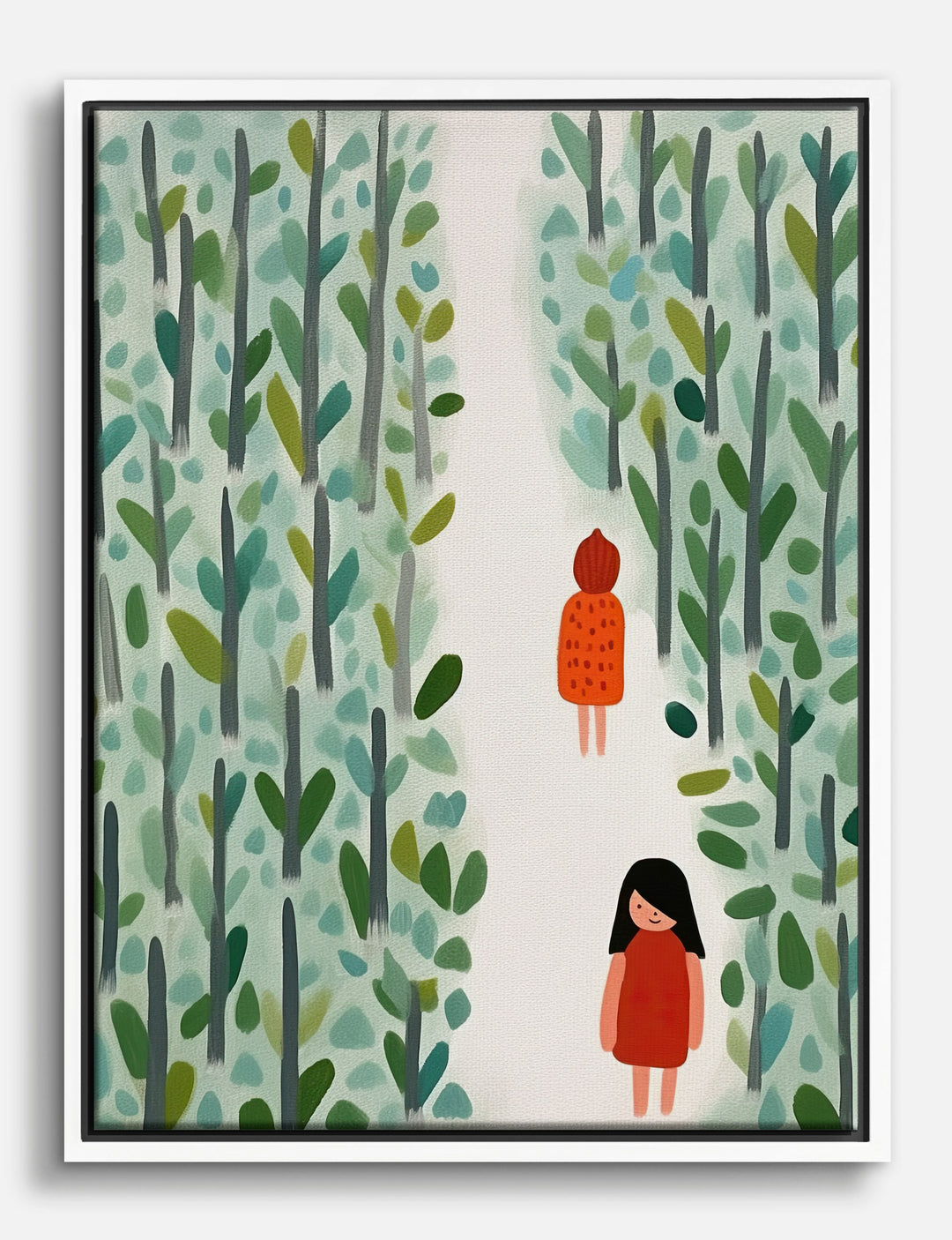 A winding trail through whimsical woods, two tiny figures in playful orange invite you to wander and wonder. This piece sparks curiosity and a sense of gentle adventure, perfect for your living room or a cozy corner where stories unfold. The fresh greens and soft blues blend effortlessly with modern or minimalist décor, bringing a touch of nature and warmth to your home. Let your walls tell a story of connection and quiet discovery—stylish, personal, and uniquely yours.