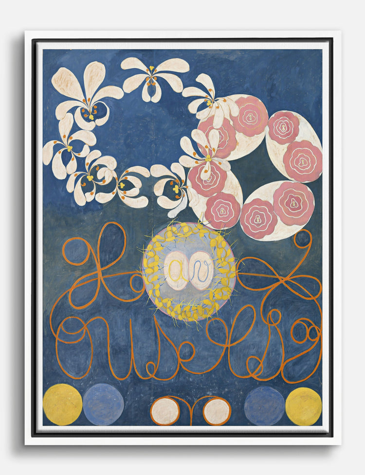 Swirls of blush pink, creamy white, and golden yellow come alive against a deep blue backdrop, inviting a sense of playful wonder into your home. This Hilma Af Klint piece radiates joy—its looping forms and floral bursts feel like a celebration of growth and imagination.