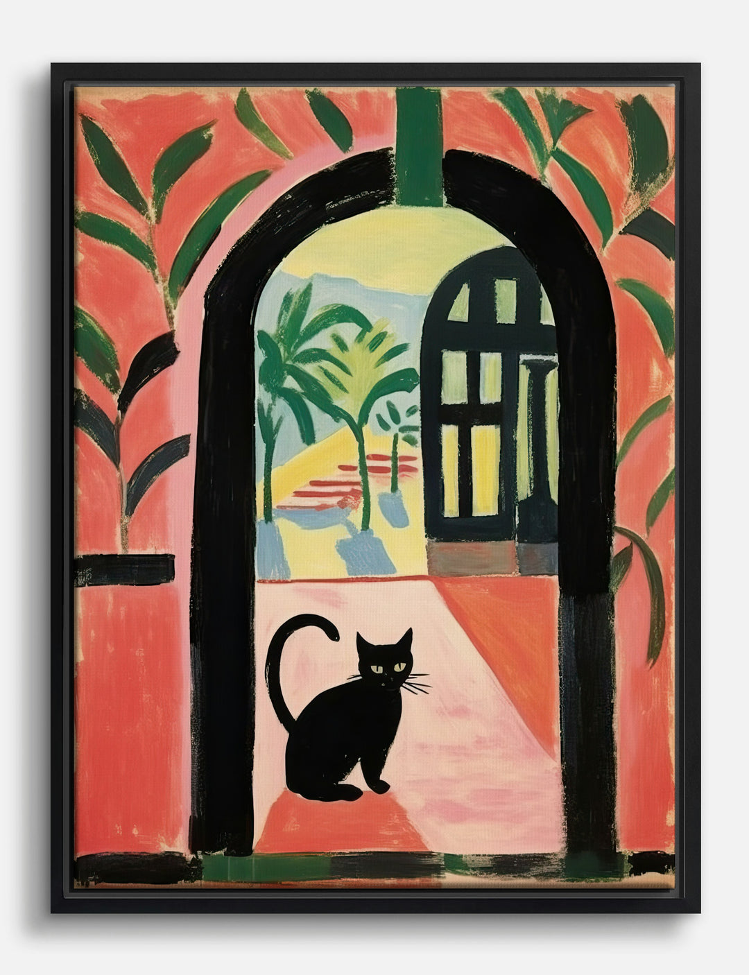 A curious black cat lounges in a sunlit archway, inviting a playful sense of adventure into your home. With its bold shapes and vivid pinks, this piece instantly brightens your space and sparks conversation—perfect for anyone who loves a touch of the unexpected. Style it in your living room or bedroom for a daily dose of artistic flair that feels both effortless and unique. Youll love how the striking palette pops against modern or eclectic decor, making your home truly one-of-a-kind.