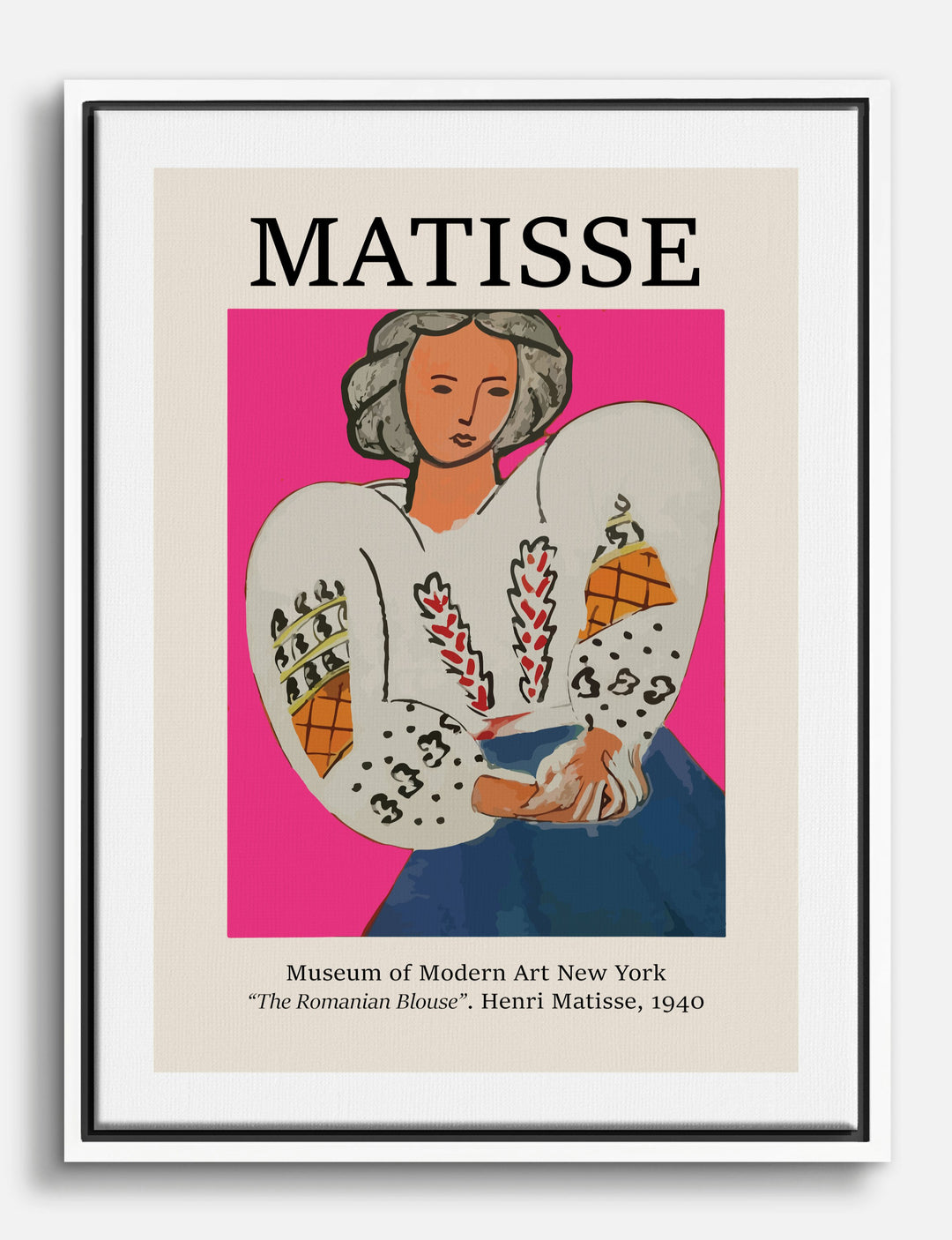 Bold color and effortless style come together in this striking homage to Matisse. The crisp, folk-inspired blouse pops against a vivid pink backdrop, infusing your space with energy and sophistication.