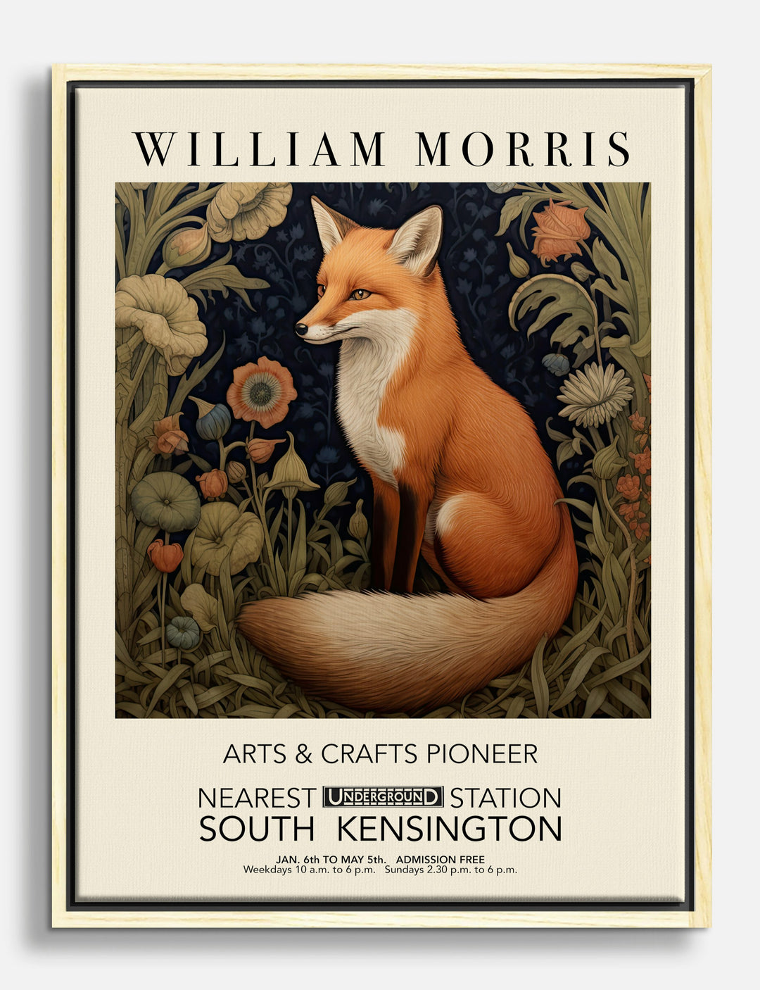 A striking red fox sits poised among lush wildflowers, bringing a sense of timeless charm and curiosity to any room. This piece channels the iconic William Morris style, blending nature’s beauty with artful pattern for a touch of vintage sophistication.