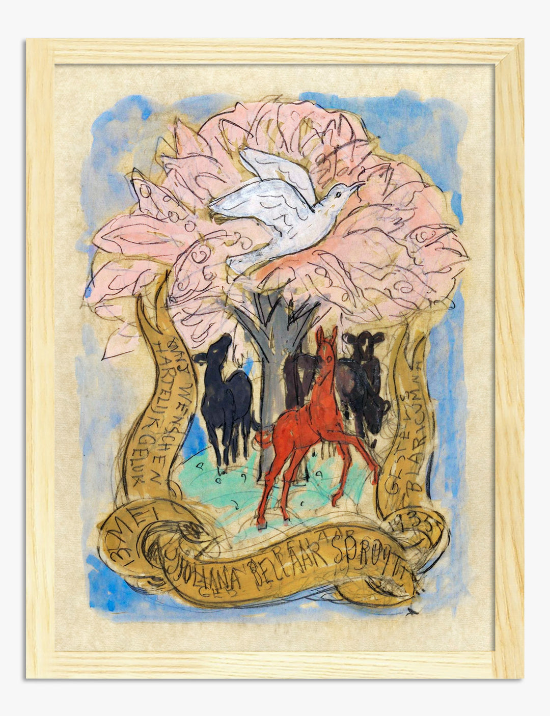 A gentle cascade of pink petals unfolds around a lively scene—horses gathered under a flowering tree, crowned by a soaring white dove. This piece radiates a sense of hope and renewal, perfect for anyone wanting to invite uplifting energy into their home.