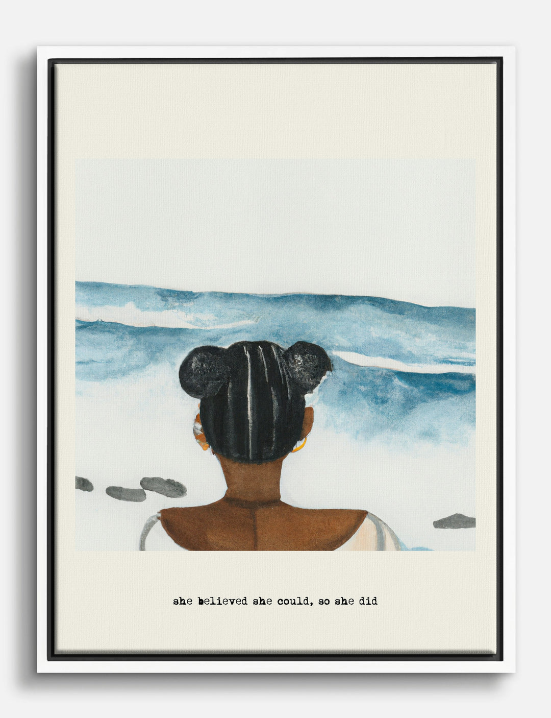 Bold confidence meets serene escape in this empowering piece. A woman gazes out at rolling blue waves, her presence grounded yet full of promise. Hang this in your bedroom or office to remind yourself daily that you’re capable of anything. The cool blues and soft neutrals blend effortlessly with modern or minimalist decor, bringing both calm and inspiration into your space. When you need a boost, let this artwork whisper: yes, you can.