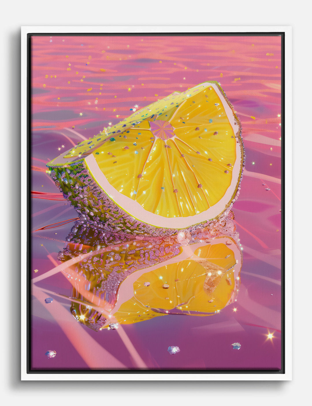 A slice of zesty sunshine meets disco glam—this piece turns any wall into a party. The dazzling lemon floats on a shimmering pink backdrop, radiating playful energy and sparkling confidence.