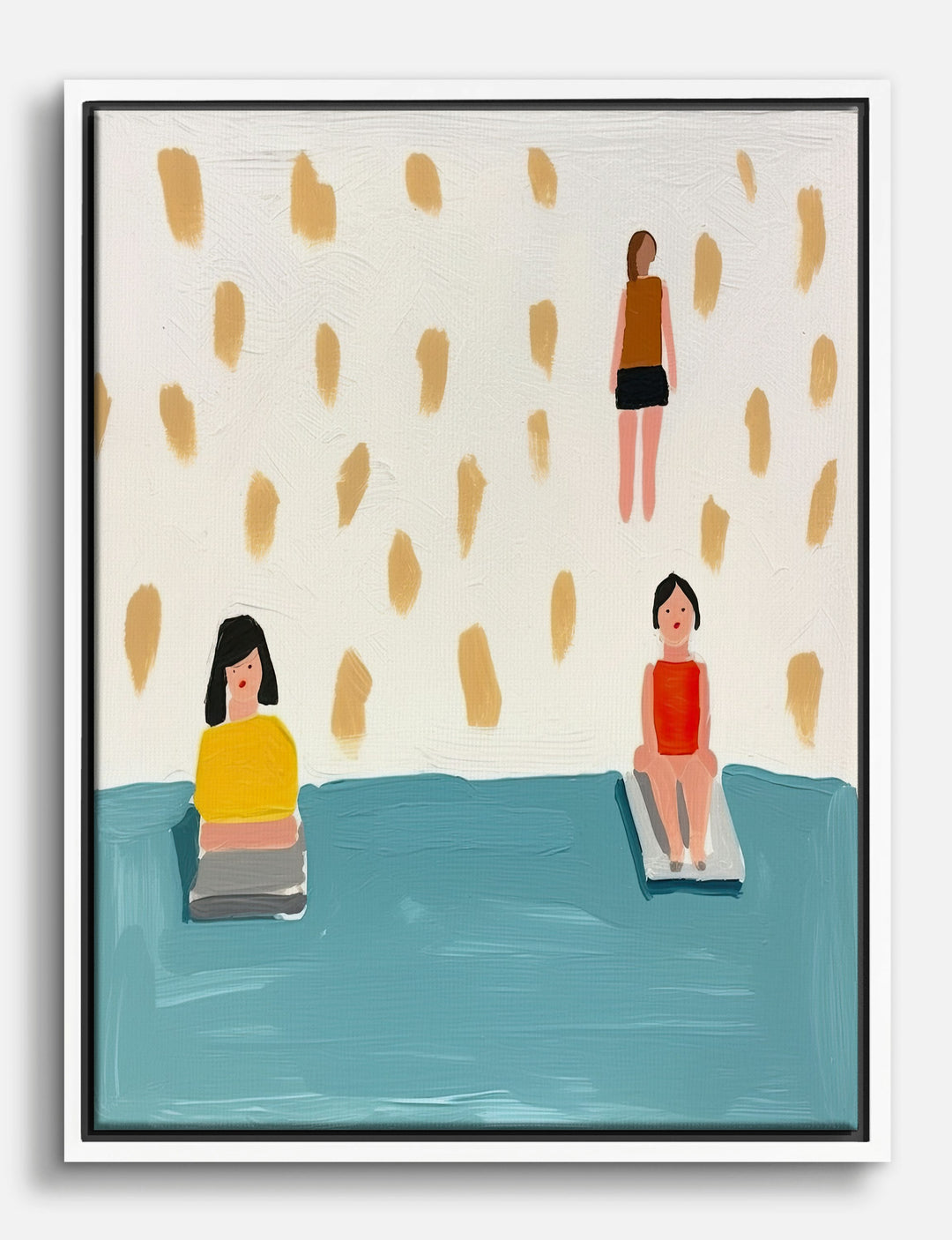 A splash of playful color and relaxed vibes — this piece brings a breezy, modern twist to your walls. The bold, simple figures and soft blue and gold tones create a scene that feels both fresh and nostalgic, like the best summer memories. Hang it in your living room or bedroom for a daily reminder to slow down and savor the little things. Youll love how easily it pops against any decor, adding a touch of personality and charm to your favorite space.