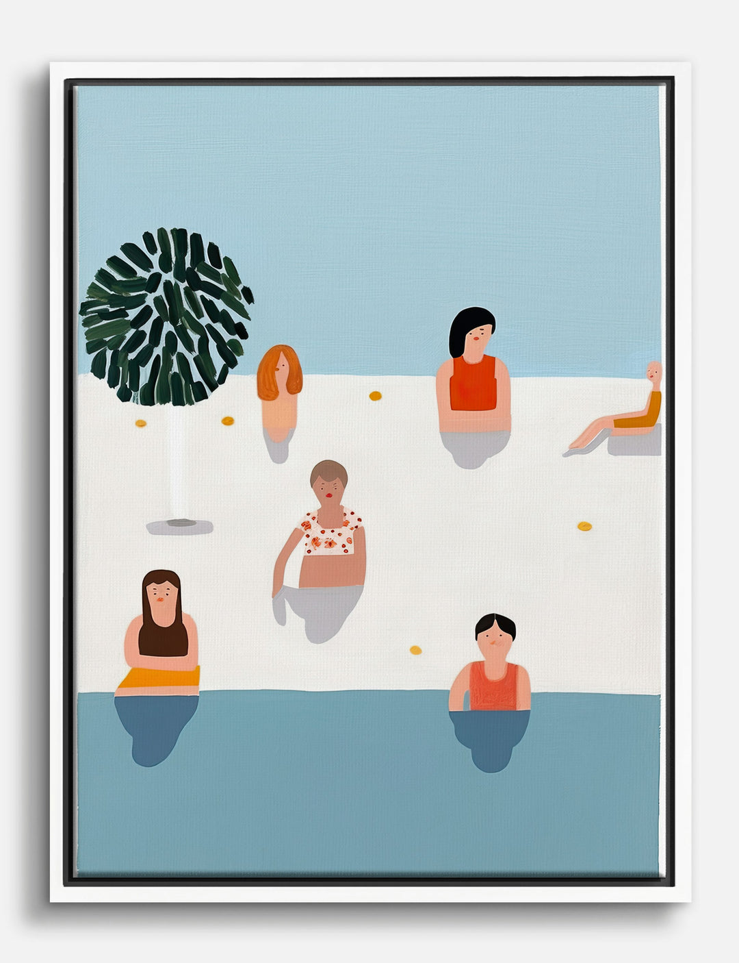 Sun-soaked afternoons come alive in this playful, modern piece, where friends gather by the pool and every detail feels like a breath of fresh air. The crisp, calming palette of sky blues and soft neutrals instantly lightens your space, infusing it with effortless relaxation and charm.