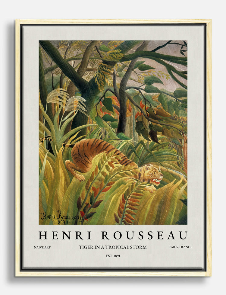 Feel the thrill of the wild with Rousseaus enchanting jungle scene. This piece brings natures drama right into your living space, perfect for adding a touch of adventure to your living room or office. The lush greens and vibrant hues effortlessly complement any decor style, making your home a haven of style and self-expression.