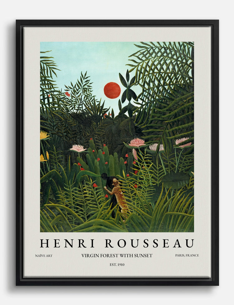 Step into a lush paradise with Rousseaus captivating jungle scene. This vibrant artwork brings natures mystery and beauty right into your space. Perfect for your living room or bedroom, its rich greens and fiery sunset hues add a splash of wonder and intrigue. Transform your home effortlessly, and let the wild spirit of the jungle inspire your everyday life with this unique piece.