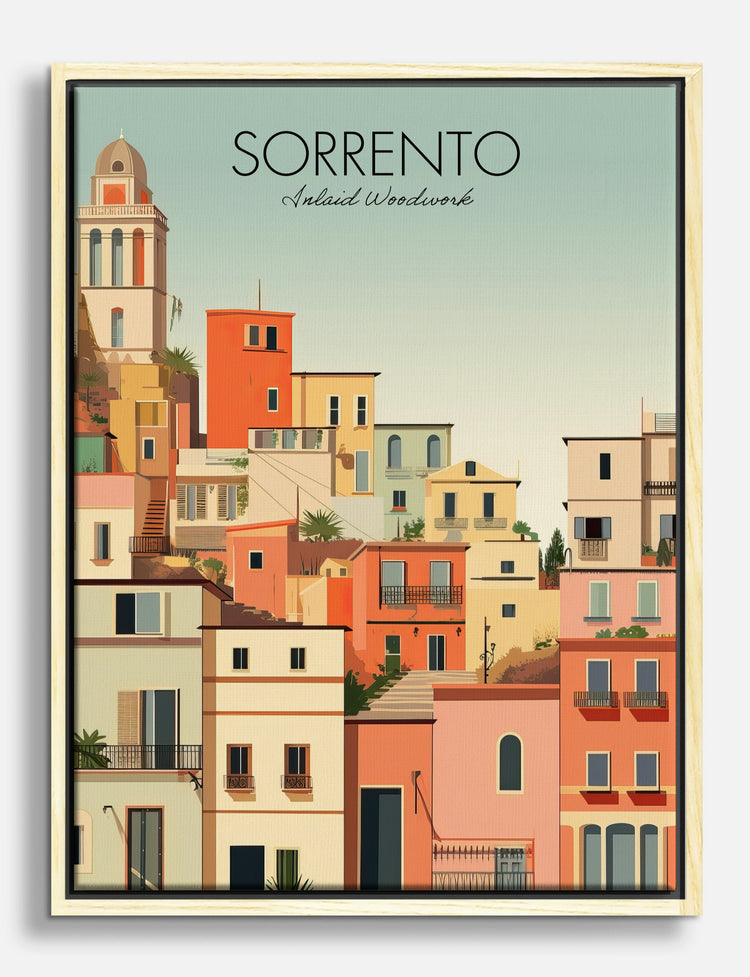 Step into the sun-drenched charm of Sorrento every time you walk into your home. This vibrant cityscape layers warm peach, coral, and soft yellow tones, instantly brightening your favorite wall. The playful mix of pastel buildings and Mediterranean flair brings a stylish, uplifting vibe to your living room or bedroom.