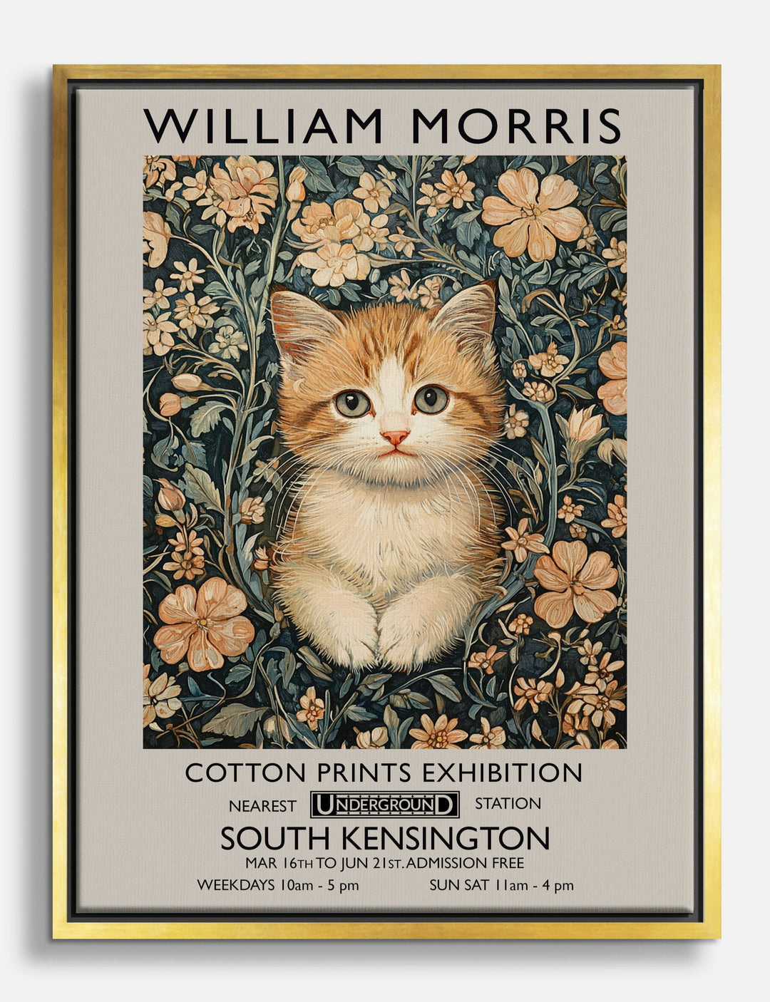 Transform your space with the whimsical charm of this William Morris-inspired kitten print. Nestled among intricate floral patterns, this adorable feline brings a touch of vintage elegance to any room. Perfect for the bedroom or living room, its warm palette effortlessly complements a variety of decor styles, inviting a sense of joy and comfort into your home. Let this unique piece brighten your wall and your day.