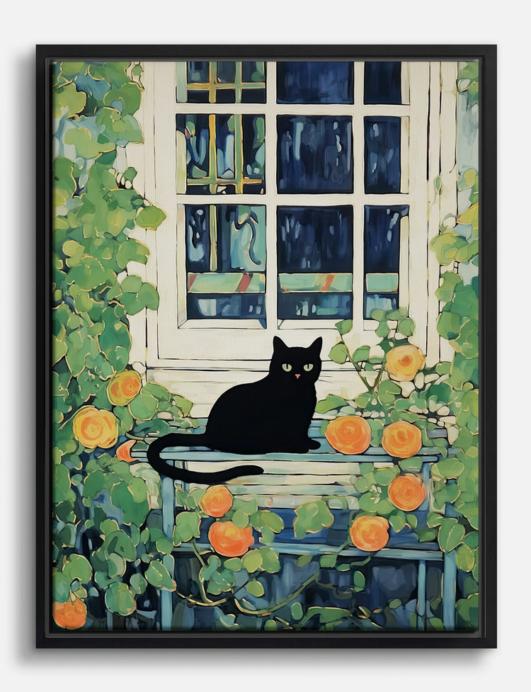 A black cat lounges in the sun-dappled garden, framed by lush greenery and bursts of golden-orange blooms. This piece instantly brings a sense of quiet magic and cozy sophistication to your space.