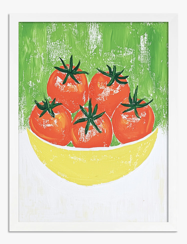 Bold, sun-ripened tomatoes burst with personality in this charming, hand-drawn piece. The vibrant reds and lush greens instantly energize your space, while the playful yellow bowl adds a dash of joy to any wall.