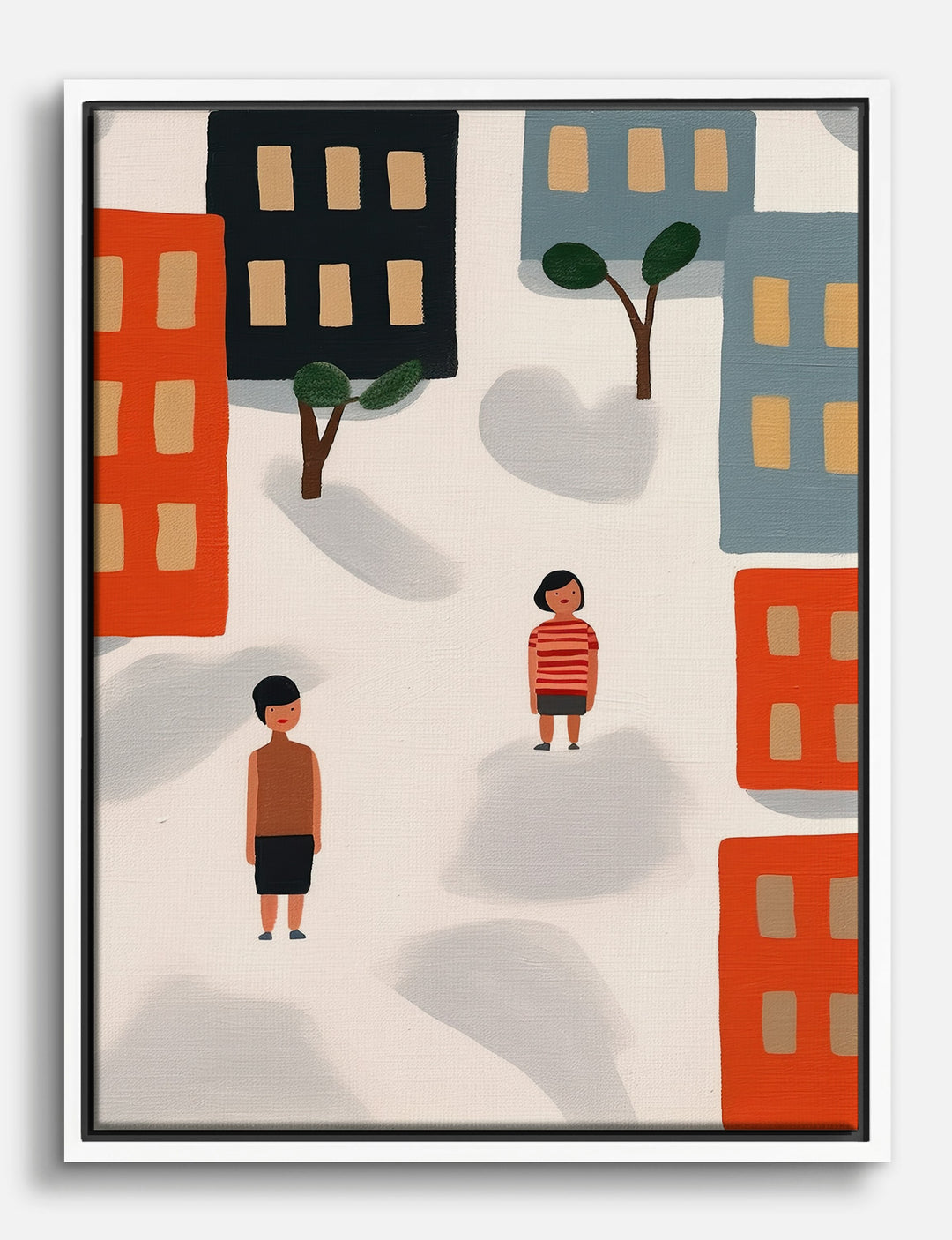 Bold blocks of color and playful shapes bring a fresh energy to your walls. This piece captures the quiet magic of city life—two tiny figures, big open space, and the welcoming charm of simple buildings. It’s the perfect way to add a touch of warmth and modern style to your living room or study, effortlessly blending with both colorful and neutral decor. You’ll love how it sparks conversation and invites a sense of curiosity into your home.