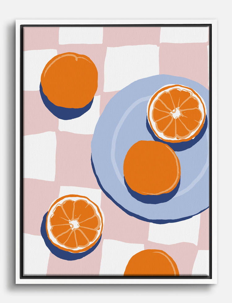 Fresh, zesty, and playful—these vibrant oranges bring an instant hit of joy to your kitchen or dining nook. The bold pops of orange against a soft pink checkerboard background create a look that’s both retro and totally now.