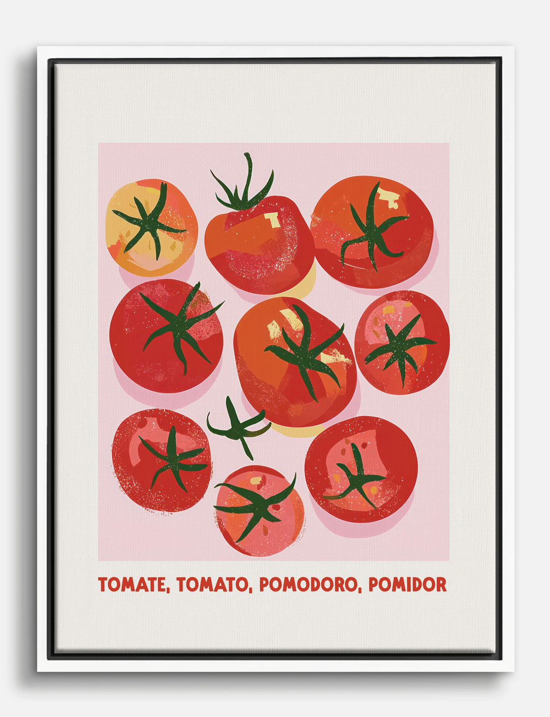 A burst of ripe reds and playful shapes, this piece instantly enlivens your kitchen or dining nook. Let these juicy tomatoes—named in four languages—spark joy and conversation every time you walk by.