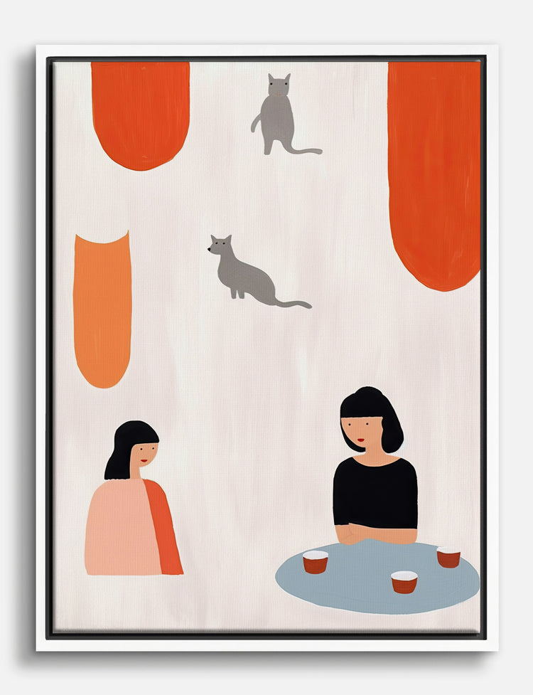 Two friends, three cups, and a pair of curious cats—this playful scene brings a gentle spark of connection to your walls. The bold pops of orange and red, softened by creamy neutrals, instantly brighten any nook, making it perfect for your kitchen or dining space. Let this piece remind you that every day deserves a moment of warmth and laughter—no reservations required. With its modern, minimalist vibe, you’ll feel proud to show off your unique style, all while keeping things effortlessly affordable.