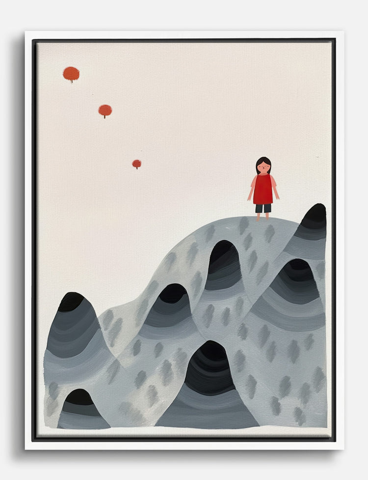 A gentle sense of wonder unfolds as a tiny figure stands atop sweeping grey hills, inviting you to see adventure in every corner of your home. The soft curves and playful pops of red bring a touch of whimsy and warmth, making this piece a perfect companion for your favorite nook.