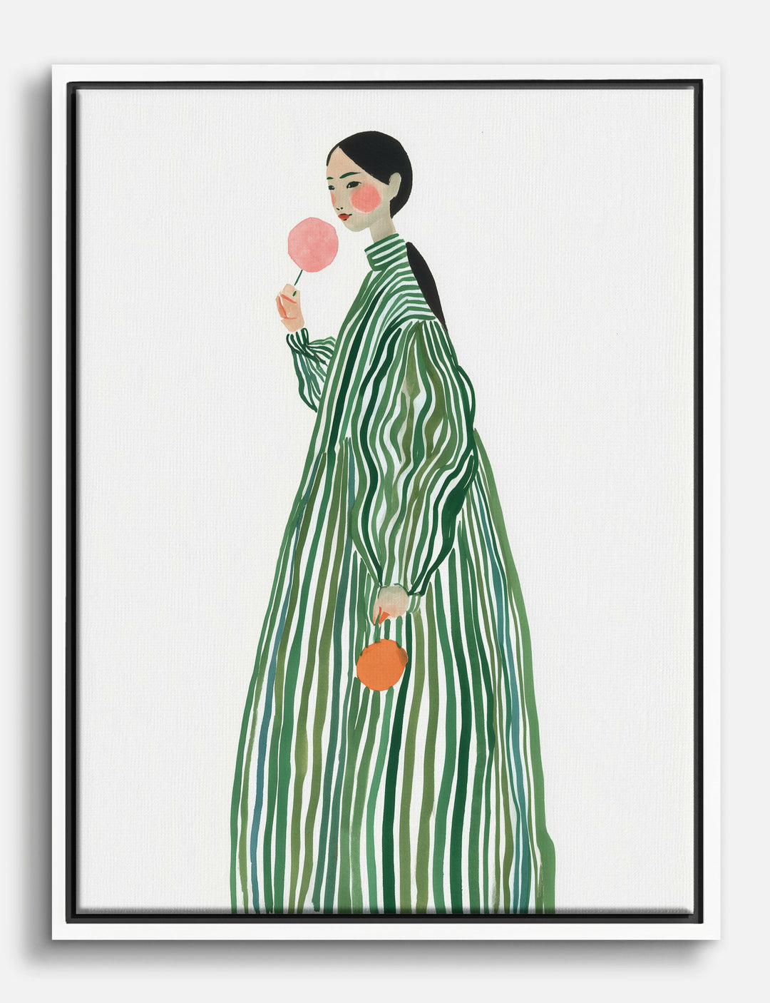 Bold stripes meet quiet confidence in this effortlessly chic piece. A woman in a flowing green dress strolls with a sense of purpose, her pops of orange and pink adding playful energy to the calm. There’s a subtle story here—one of individuality, courage, and everyday beauty. Hang this in your bedroom or living room for a fresh, modern vibe that feels both stylish and approachable. The green and white palette makes it easy to pair with neutrals or to layer with bolder accents. Every glance will remind you that great style is simply about being yourself. Affordable, unique, and ready to transform your space—this is the kind of art that makes you feel right at home.