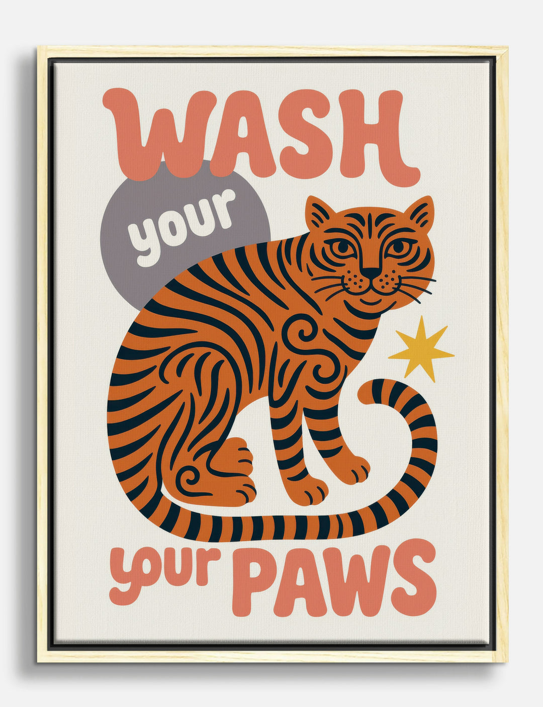 A playful tiger brings a burst of personality to your space, reminding everyone that self-care can be stylish. With bold stripes and warm, inviting hues, this piece instantly energizes your walls—perfect for brightening up a bathroom, entryway, or kid’s room. The retro-inspired palette pops against both modern and vintage decor, giving your home a fresh, confident vibe.
