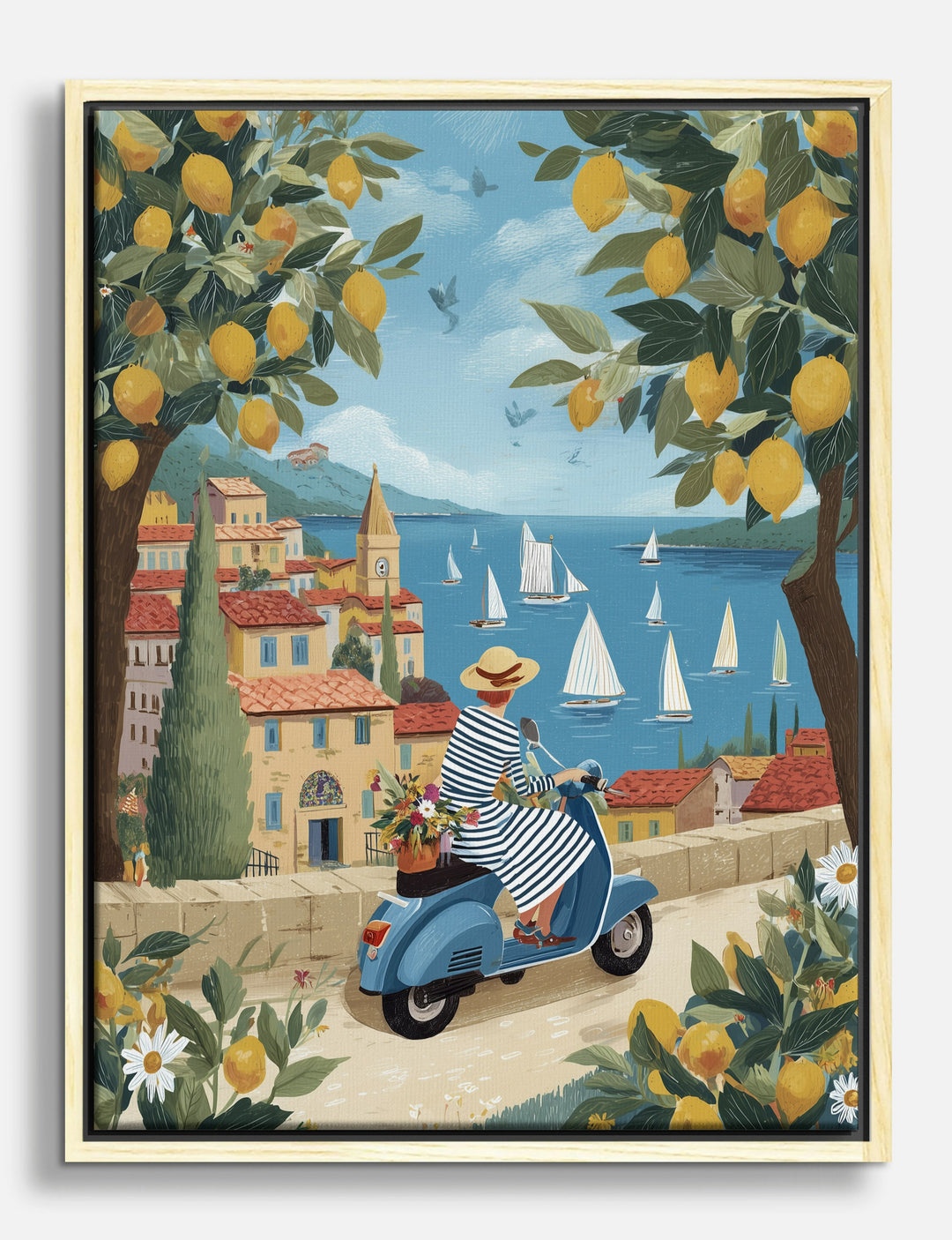 Sunshine, citrus, and seaside charm—this piece instantly transports you to the heart of the Italian Riviera. Picture yourself zipping along winding coastal roads, the salty breeze in your hair and a basket of fresh blooms at your side. The playful palette of lemon yellows, sky blues, and terracotta rooftops pops against any wall, making your living room or entryway feel effortlessly vibrant. It’s the kind of art that sparks wanderlust and brings a little Mediterranean magic home, no passport required. Let this print remind you every day that life’s best moments are the ones you make your own. Hang it up and watch your space—and your spirits—brighten.