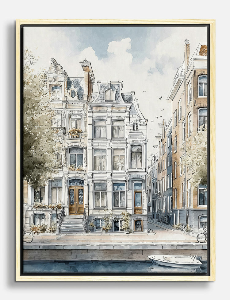 Step into the charm of old-world Europe every time you glance at your wall. This watercolor scene captures the timeless beauty of Amsterdam’s canal houses, where elegant facades and tranquil waters meet.