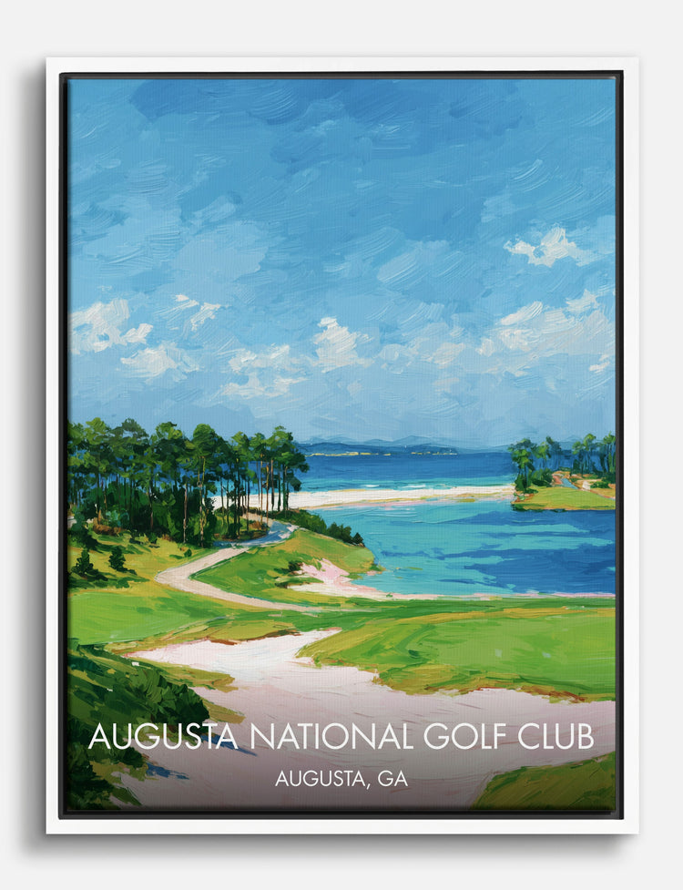 A stretch of vibrant green fairway meets the tranquil blue of water and sky—this artwork brings the legendary Augusta National right into your home. The painterly brushstrokes capture both the energy and calm of a perfect spring day, inviting you to pause and savor the scenery.