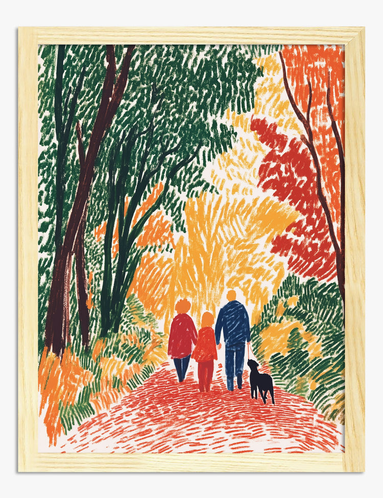Fall’s vibrant palette comes alive in this heartwarming piece, where every brushstroke feels like a leaf crunching beneath your feet. There’s a gentle magic in the way this artwork captures a simple walk—a family, a loyal dog, and a golden path winding through a forest ablaze with color. It’s a scene that radiates warmth and togetherness, perfect for any spot you want to fill with comfort and connection. Hang it in your living room or hallway to spark conversations and smiles. The bold reds, oranges, and greens pop against all kinds of decor, from modern minimalism to cozy boho. Let your home tell a story of joyful moments and everyday adventures—because style should always feel this effortless and inviting. You’ll love how this piece turns any wall into a celebration of family, nature, and the beauty of simply being together.