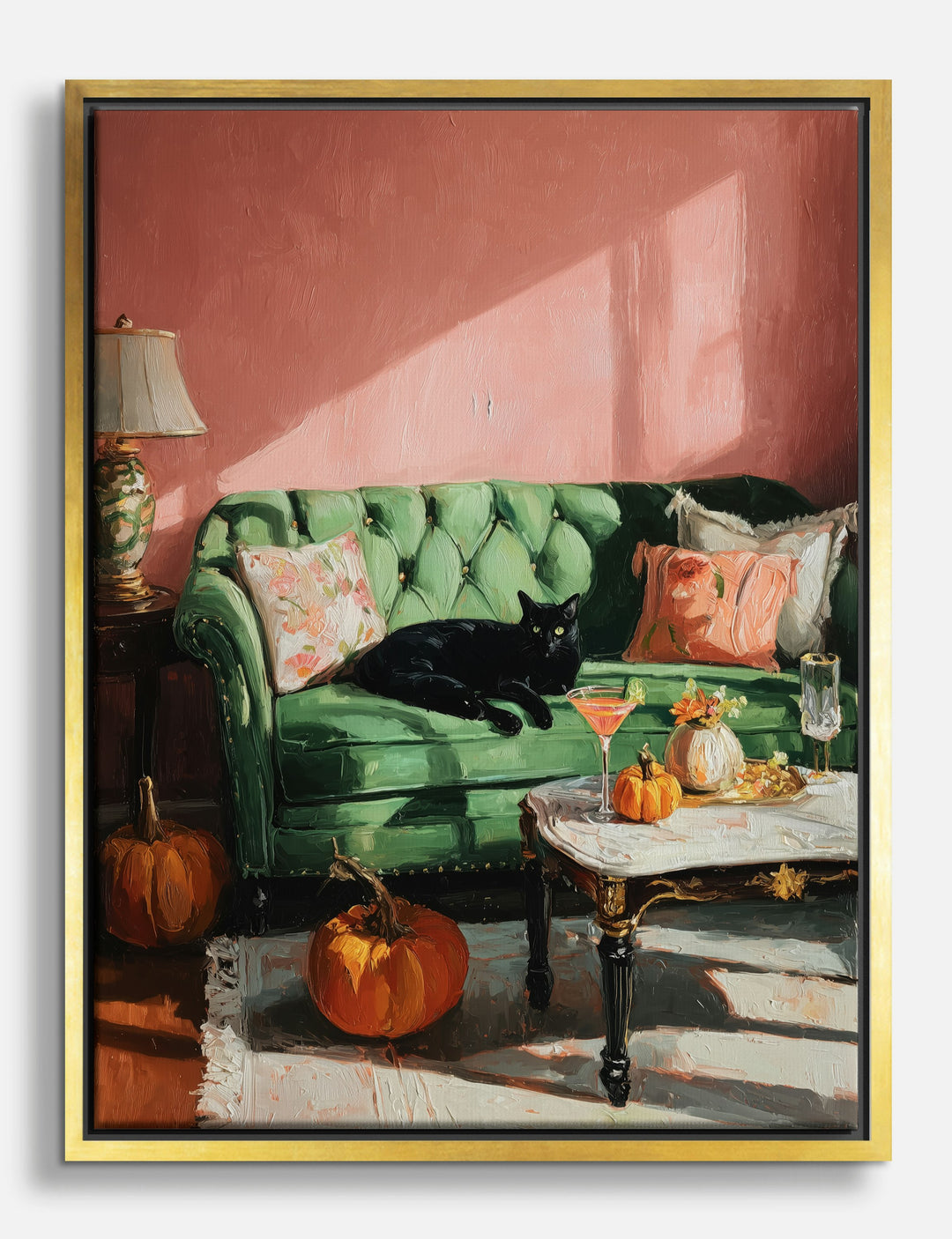 Sunlight pours across a vintage green sofa, casting the perfect stage for a lounging black cat and the cozy magic of fall. This piece wraps your space in warmth, with pumpkin accents and a playful cocktail inviting you to unwind and savor the season.