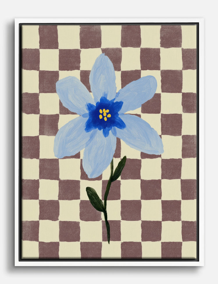 A bold blue flower blooms against a playful checkerboard backdrop—this piece is pure joy for your walls. The soft, sky-blue petals pop with confidence, while the geometric pattern keeps things feeling fresh and modern.