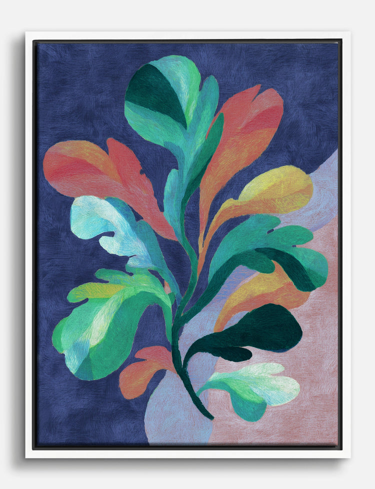 A vibrant burst of color, this piece instantly energizes any space it touches. Lush, abstract leaves unfurl in a playful dance of teal, coral, green, and golden yellow—each stroke radiating movement and life.