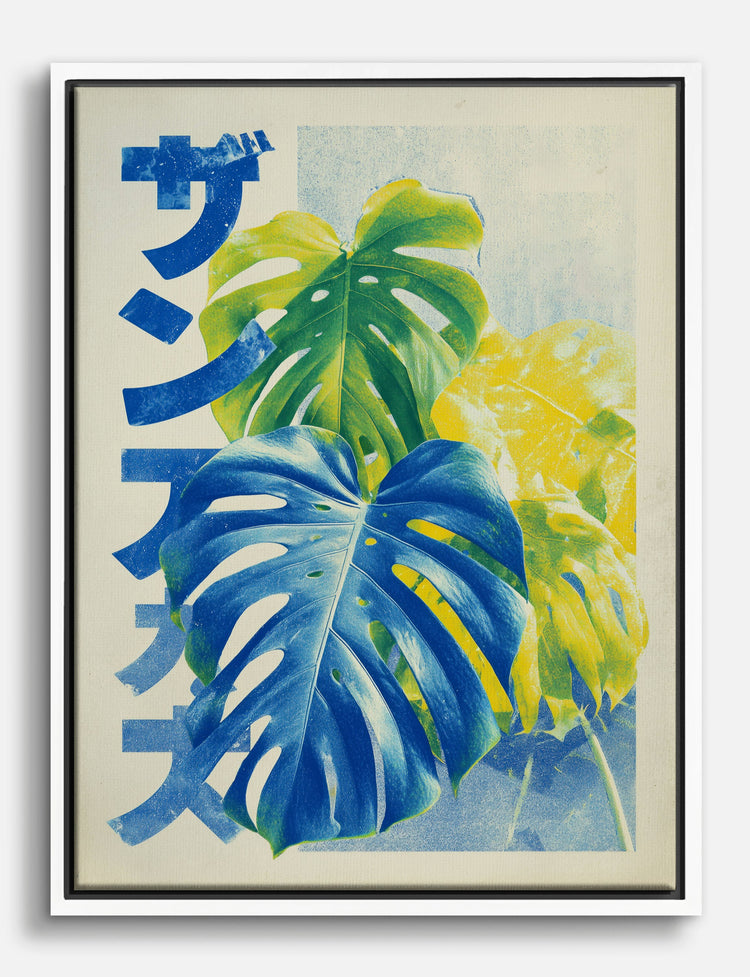 Bright, tropical leaves meet bold, graphic energy in this eye-catching piece. The lush blues and yellows of the monstera leaves instantly bring a pop of sunshine to your space—no green thumb required.