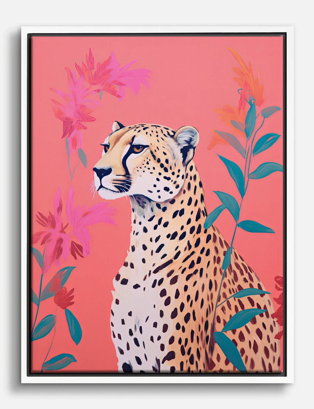 Bold style, meet wild spirit. This striking cheetah portrait, set against lush botanicals and a lively coral backdrop, instantly energizes your space. It’s the kind of statement piece that brings the perfect pop to your living room or bedroom—effortlessly chic, never overdone.