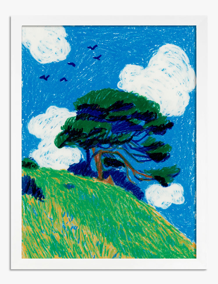 Bold color meets breezy calm in this vibrant hillside scene. A lush green slope rolls upward toward a sweeping pine, set against a sky so blue it feels almost endless—punctuated by playful clouds and soaring birds. It’s an instant mood-lifter, perfect for days when you crave a breath of fresh air right at home. Hang this piece in your living room or bedroom for a pop of color and a dash of outdoorsy energy. The rich greens and vivid blues are easy to style, pairing beautifully with both modern and eclectic decor. You’ll love how this print brings a sense of movement and optimism to your space—like summer captured on your wall, ready to inspire you every day.