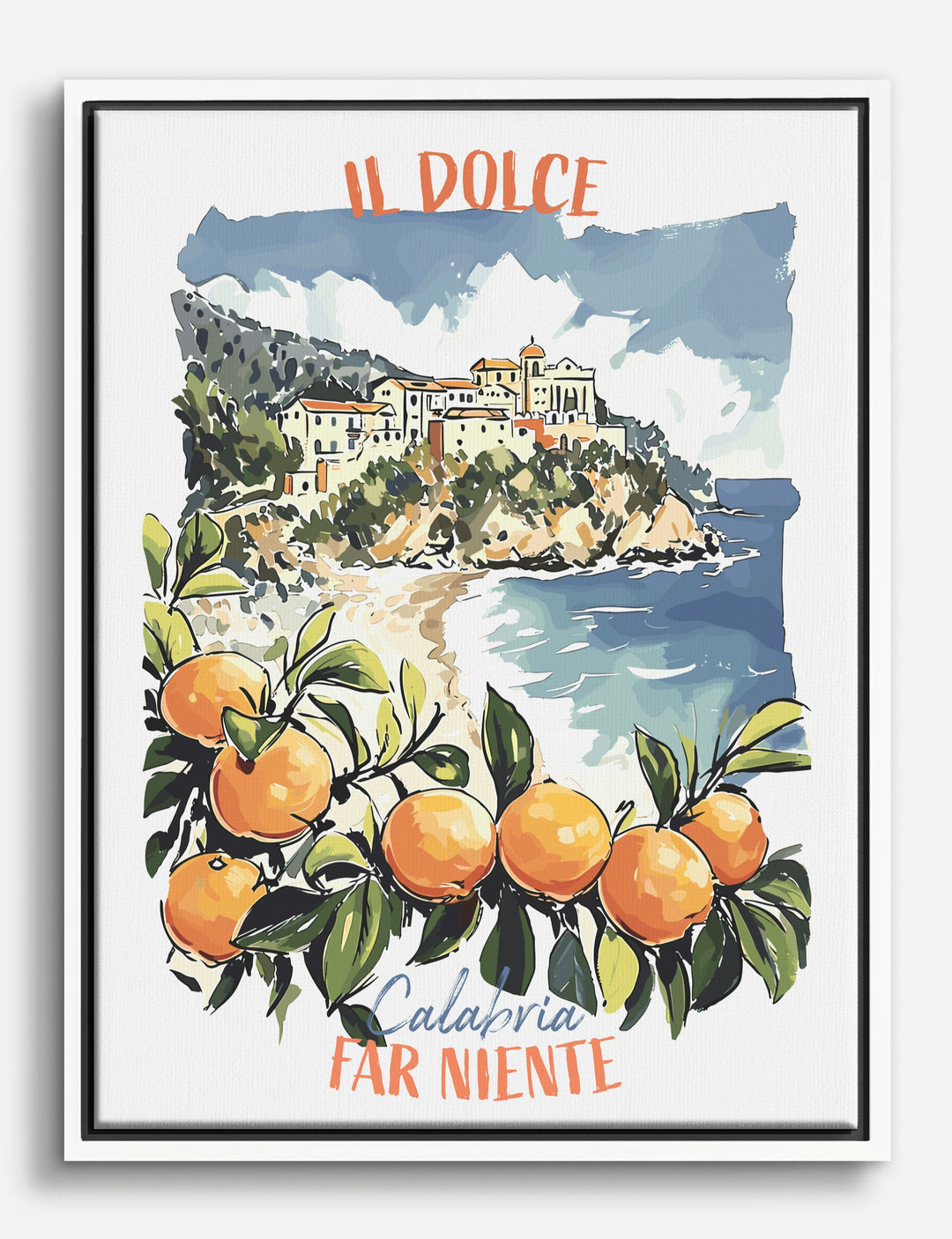 Let the charm of Calabria sweep through your space with this vibrant piece. Featuring a picturesque coastal village and lush oranges, it brings a slice of Italian tranquility to your home. Perfect for your kitchen or dining room, the artworks warm palette effortlessly complements a variety of decor styles, adding a touch of Mediterranean sunshine to your life.