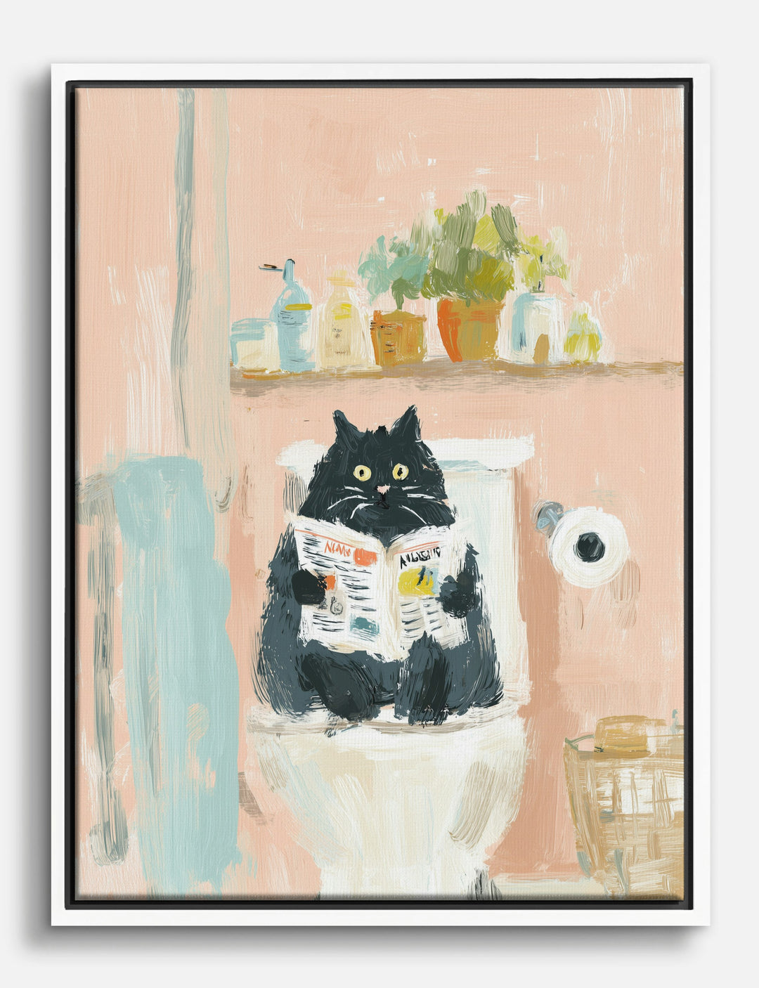 Who says style can’t have a sense of humor? This playful print features a wide-eyed black cat caught mid-read, making even the most ordinary bathroom break feel like a quirky adventure. The soft, peachy backdrop and hand-painted textures instantly warm up your walls, turning a simple corner into a conversation starter.